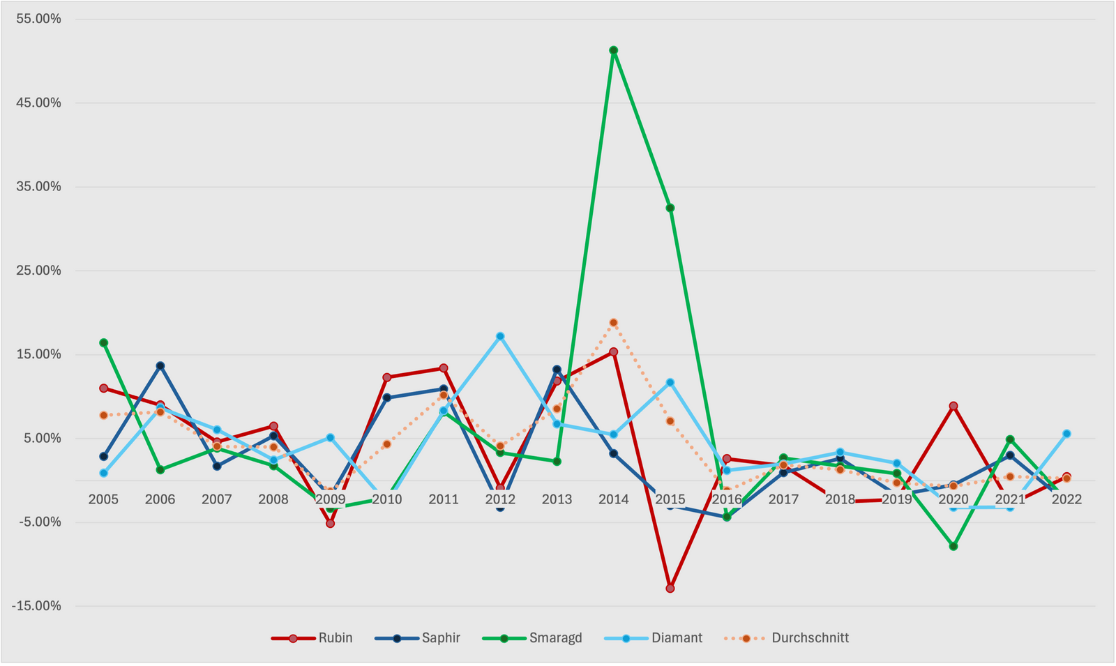 Die relative Wertentwicklung in Prozent, auch als jährliche Rendite bezeichnet, gibt die prozentuale Veränderung des Wertes der Edelsteine von Jahr zu Jahr an. Diese Kennzahl hilft Investoren, die Volatilität und das Risiko der verschiedenen Edelsteinarten zu verstehen, indem sie die jährlichen Schwankungen und die Stabilität der Renditen aufzeigt. Sie ist ein nützliches Mass zur Bewertung der kurzfristigen Performance und zur Vergleichung der Effizienz verschiedener Investitionen.