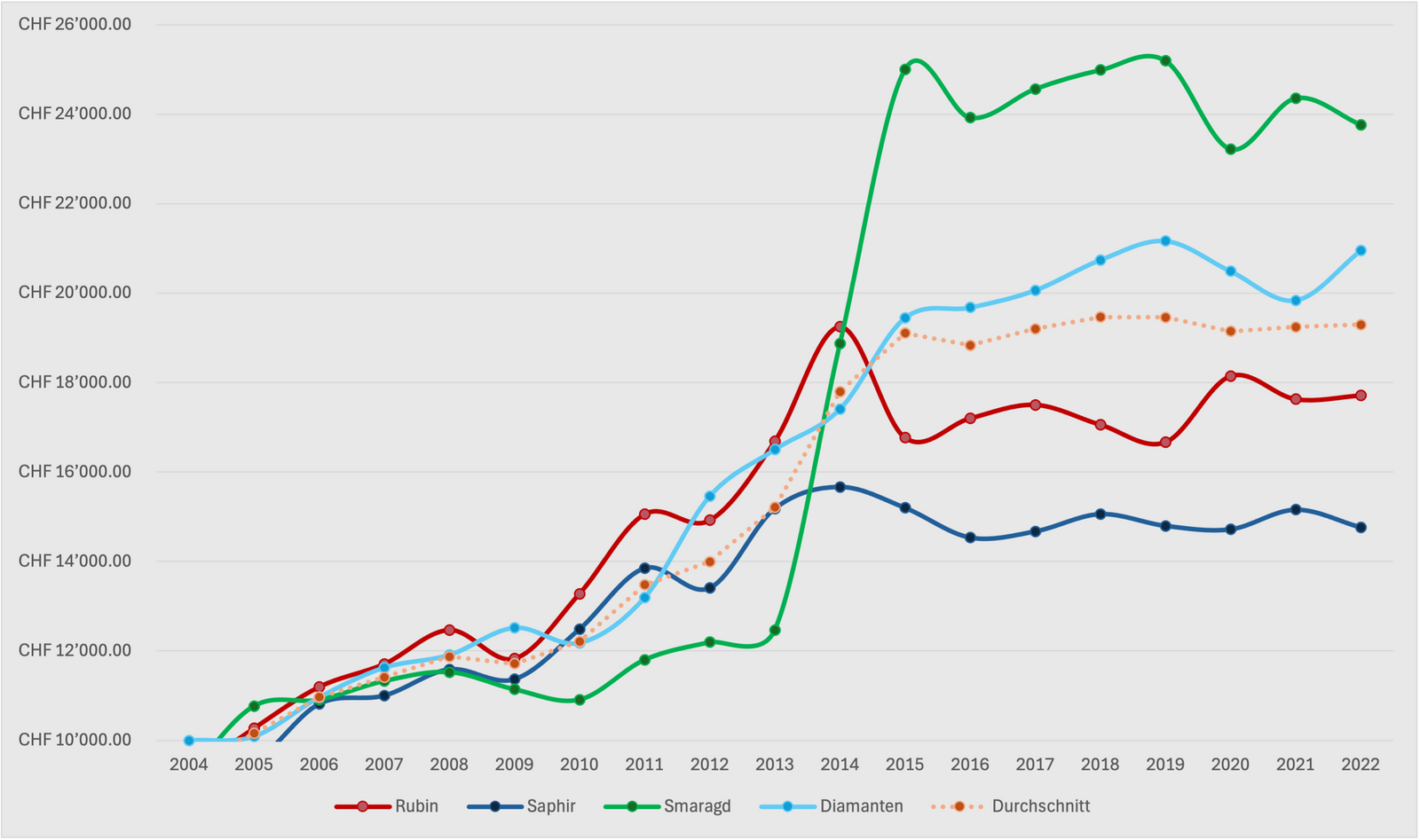 Die absolute Wertentwicklung in CHF zeigt, wie sich der Wert einer Anfangsinvestition von CHF 10'000 in verschiedene Edelsteine im Laufe der Zeit entwickelt hat. Diese Kennzahlen geben den tatsächlichen Geldbetrag wieder, den die Investition zu verschiedenen Zeitpunkten wert ist, und ermöglicht es Investoren, die langfristige Performance und das Wachstumspotenzial der Anlage zu bewerten. Sie bietet einen klaren Überblick über die Wertsteigerung oder -minderung der Investition.